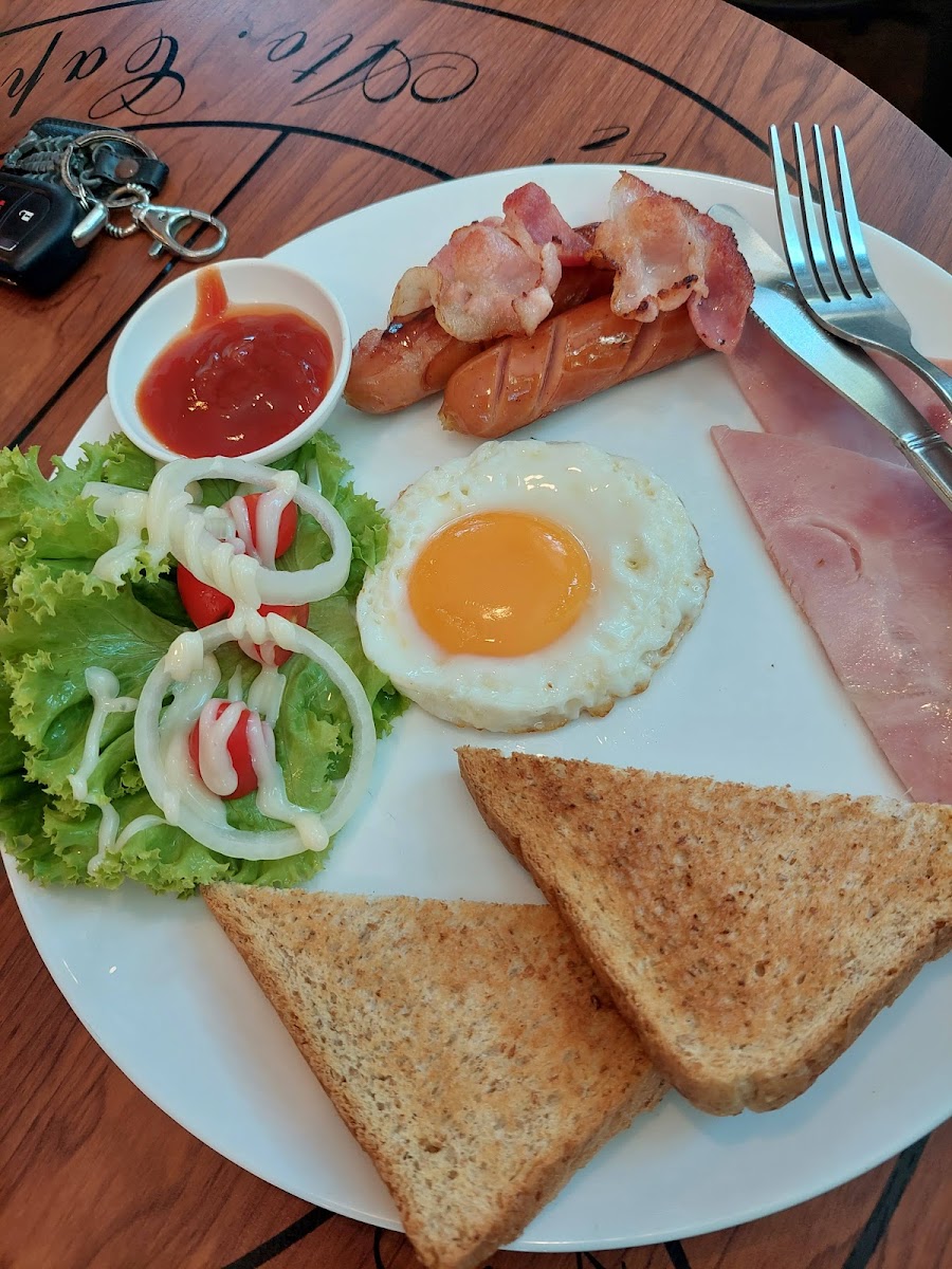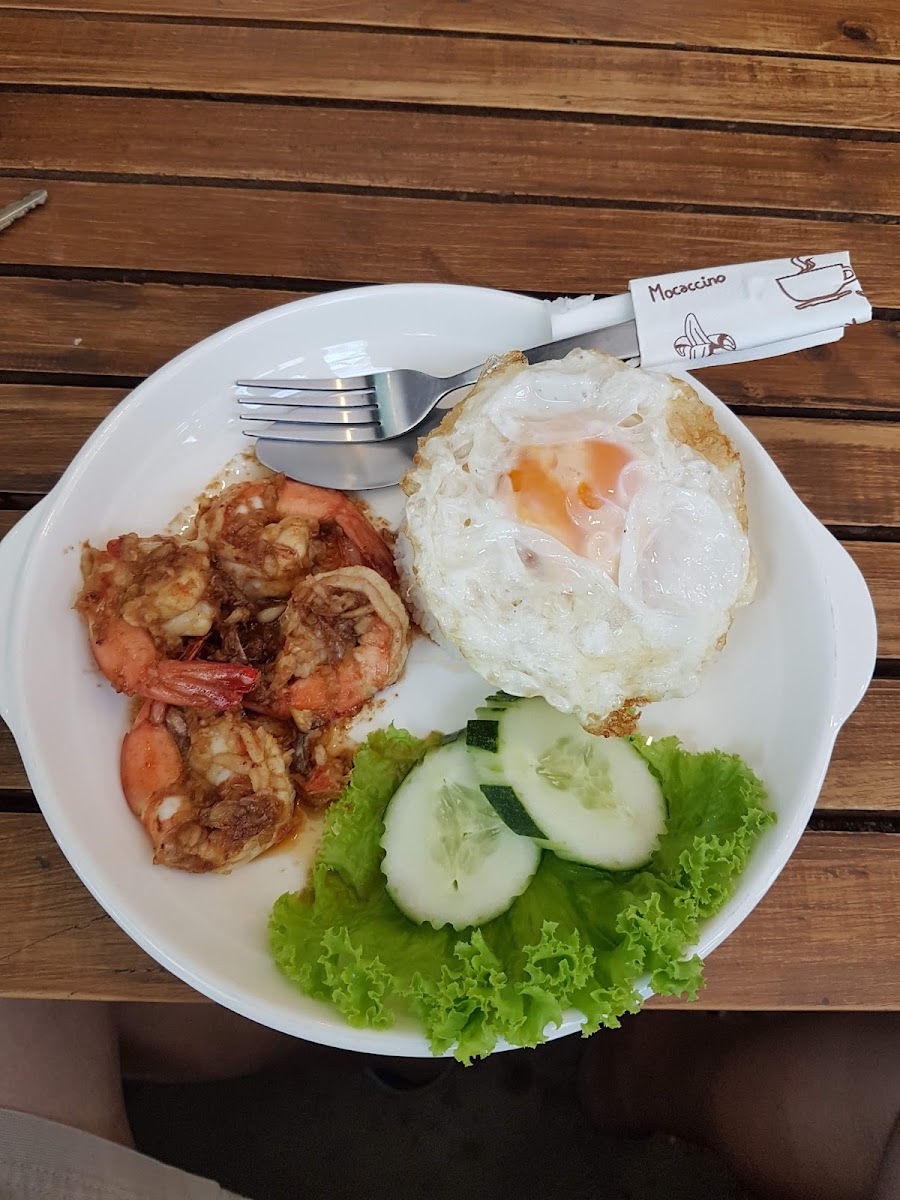 The atmosphere here is relaxed with a cozy, western-style café vibe paired with simple indoor and outdoor seating. On a typical visit, you might find locals settling in for a morning coffee or a hearty breakfast, while others drop by midday for something more substantial like their garlic chicken, spicy prawn dishes, or even one of the steak options available in the afternoon through evening. The option to eat inside with air conditioning or outside on the patio lets visitors choose their comfort depending on the weather or mood — the outdoor area tends to attract smokers.